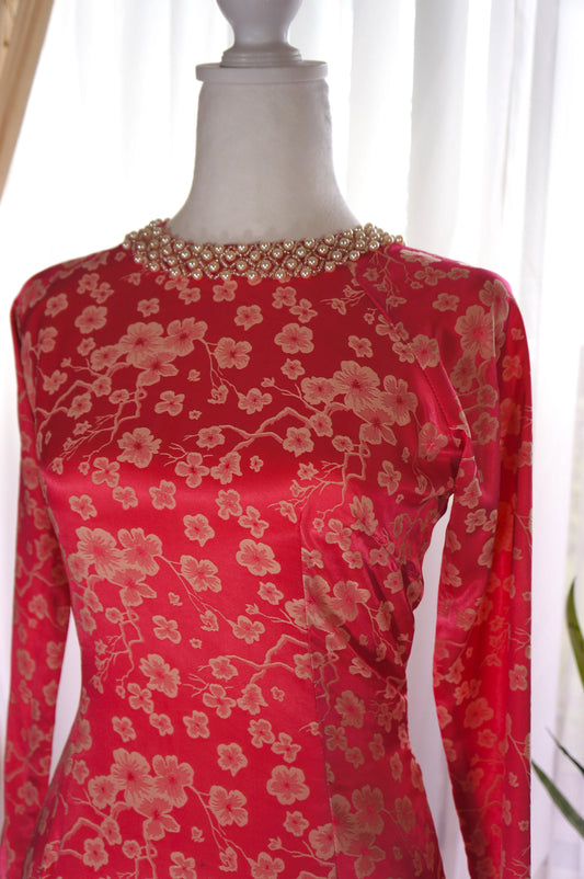 Áo dài gấm lụa sơn đào kết cườm cổ/ pearl beaded silk áo dài in pink