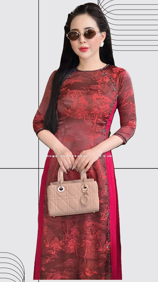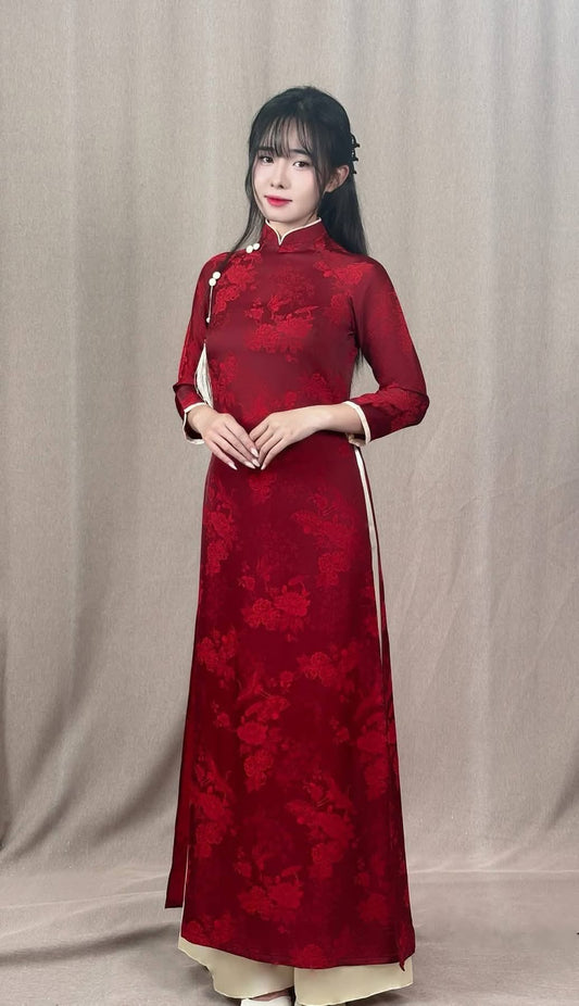 Áo dài gấm hoa gió cách tân/ set of pre-made modern Áo Dài in bordeaux