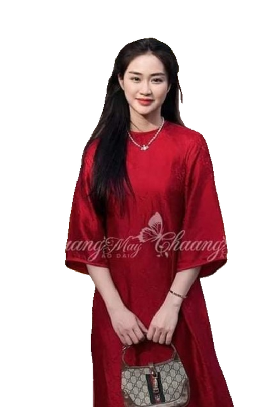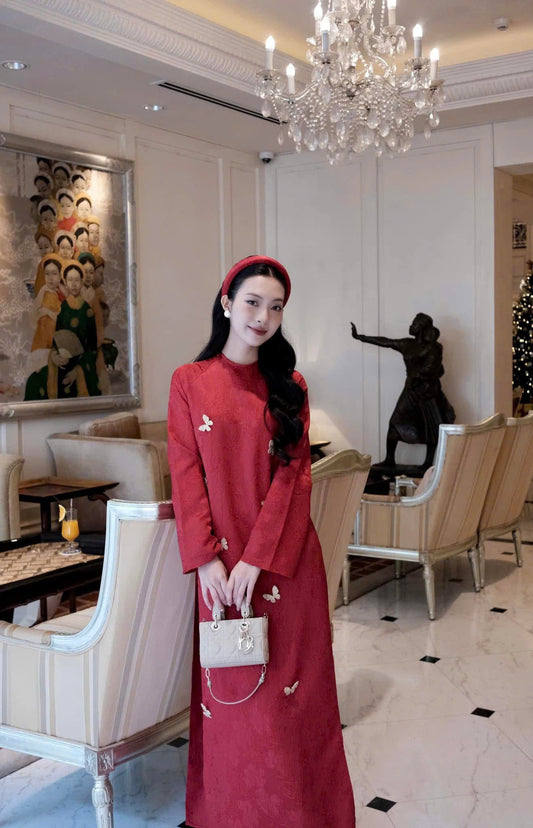 Áo dài dáng suông gấm Châu Sa đính charm hồ điệp đỏ bordeaux + quần cùng tông màu