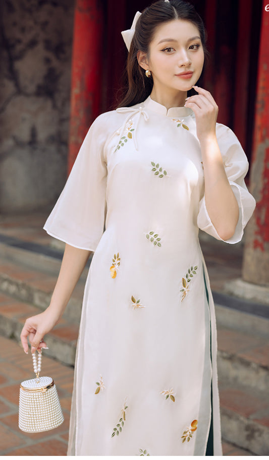 Áo dài cách tân tơ thêu hoa 2 lớp- embroidery áo dài set