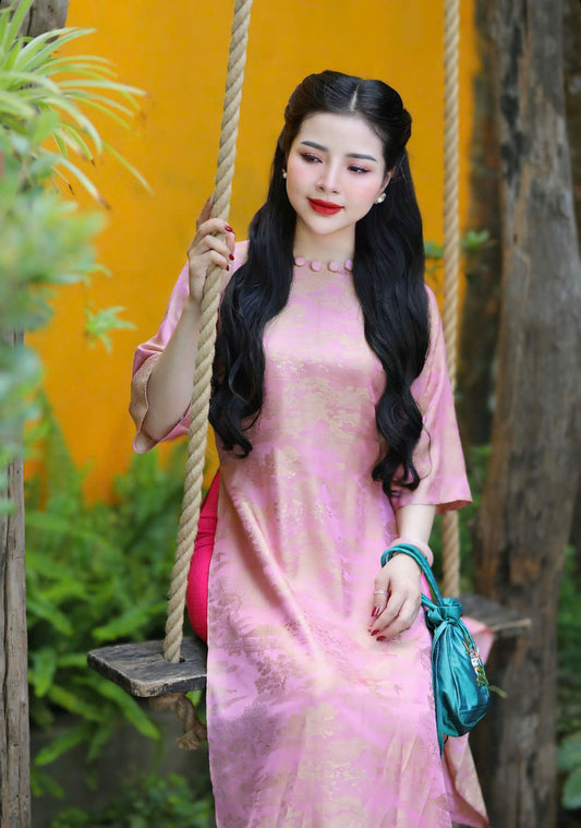 Áo dài cách tân suông gấm Vân Tiều cúc bọc màu hồng- Modern Ao Dai set