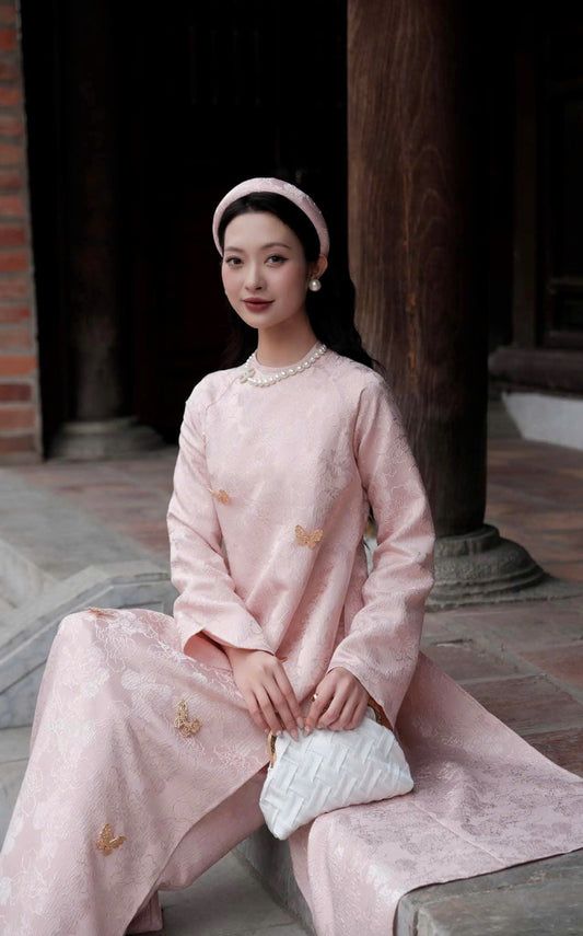 Áo dài dáng suông gấm Châu Sa đính charm hồ điệp hồng light pink + quần cùng tông màu