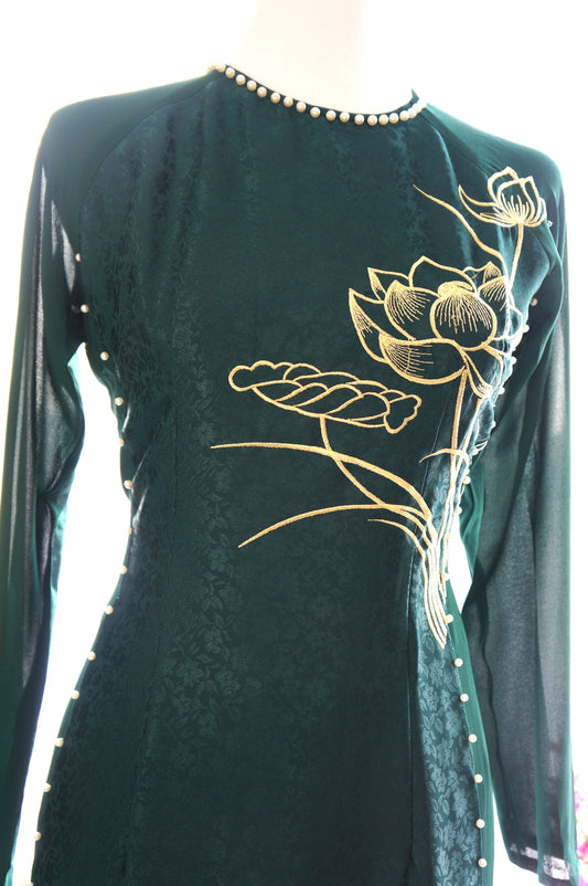 Gấm phối chiffon 4 tà quần 2 lớp thêu- pre-made set of deep green embroidery chiffon ao dai