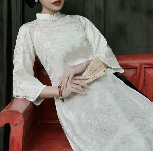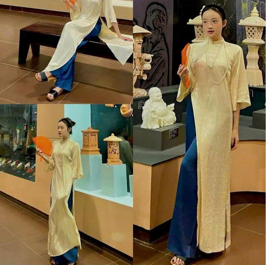 Bộ áo dài dáng xưa màu trắng kem/ set of white cream áo dài