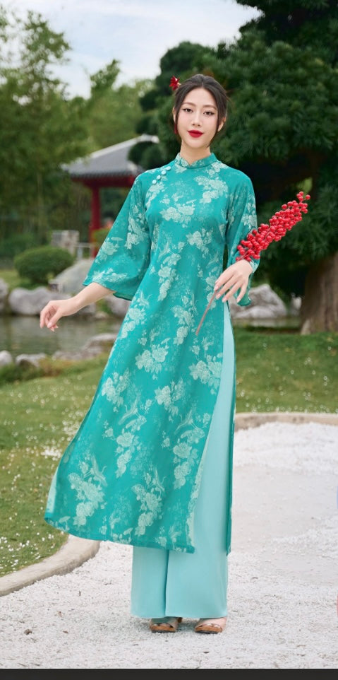 Bộ áo dài cách tân gấm xanh/ Pre-made Modern Vietnamese Ao Dai set