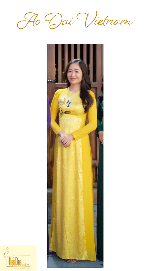 Bộ áo dài gấm vàng chanh phối chiffon thêu 4 tà, quần chiffon 2 lớp/ set of lemon yellow embroidery traditional áo dài