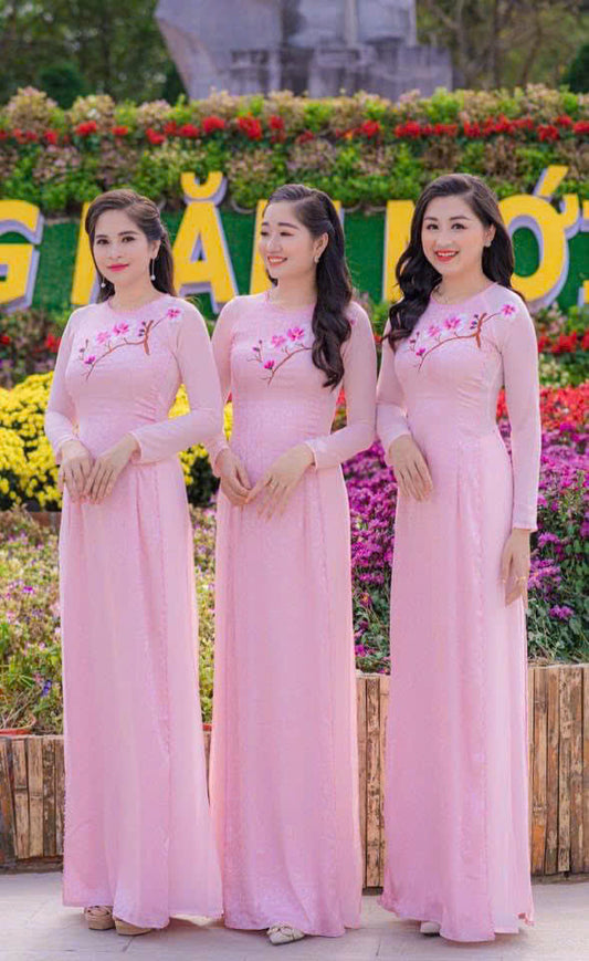 Gấm phối chiffon 4 tà quần 2 lớp thêu- pre-made set of pink embroidery chiffon ao dai