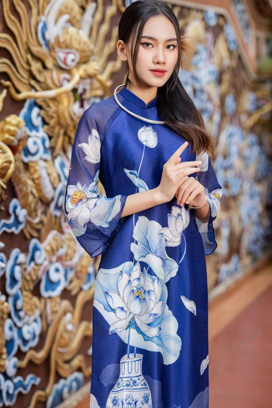 Set Áo dài sen xanh đính cườm- set of double layers blue lotus áo dài
