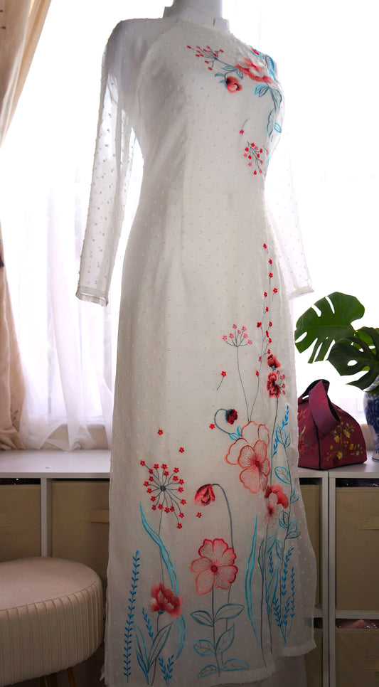 Set áo dài trắng tơ thêu hoa 2 lớp, 4 tà
