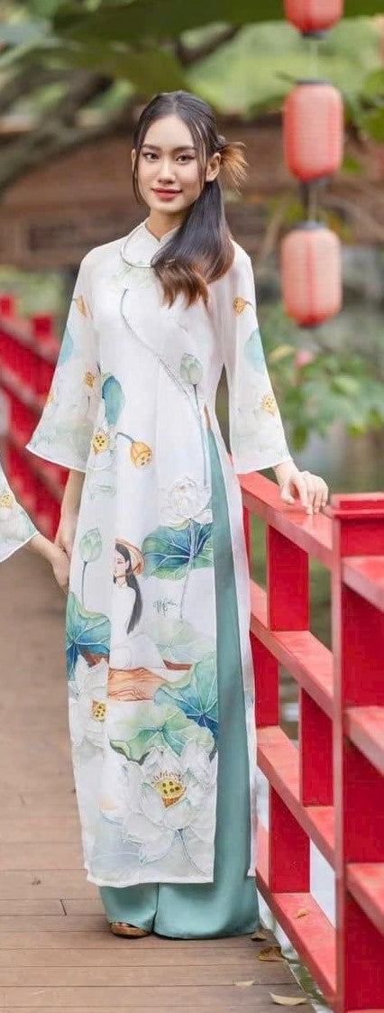 Set Áo dài sen trắng kem đính cườm- set of double layers ivory lotus áo dài for girls