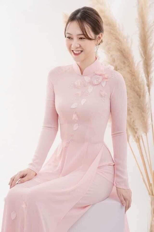 Set áo dài cách chiffon 4 tà thiết kế hoa rơi- Pre-made traditional Vietnamese Ao Dai set in pink