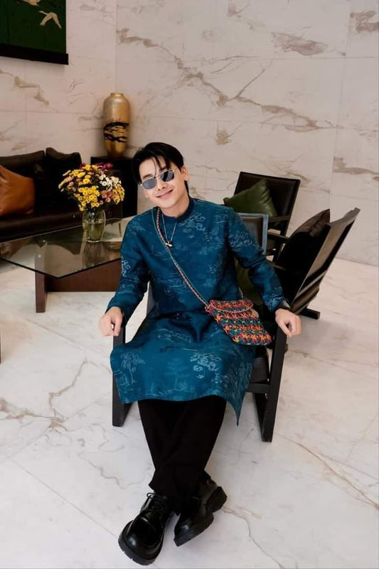 Áo dài nam Thủy Hạc tafta thêu-men's áo dài in deep blue