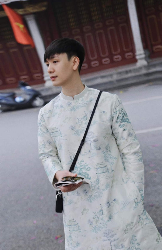 Áo dài nam thêu tơ màu trắng thủy hạc- pre-made modern white embroidery áodài for men